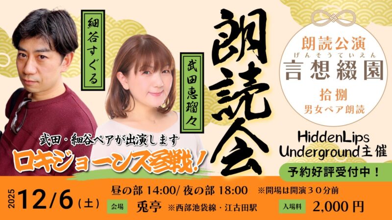 【出演情報】HLUGさん主催「言想綴園拾捌」 男女ペア朗読回に 武田恵瑠々と細谷すぐるのロキジョーンズペアが出演します!